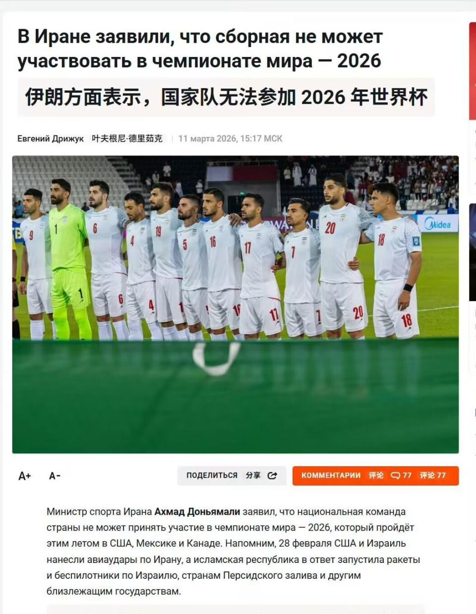 3月11日,伊朗体育部部长杜尼亚马利在接受媒体采访时表示:介于局势问题,伊朗男足将退出2026年美加墨世界杯。